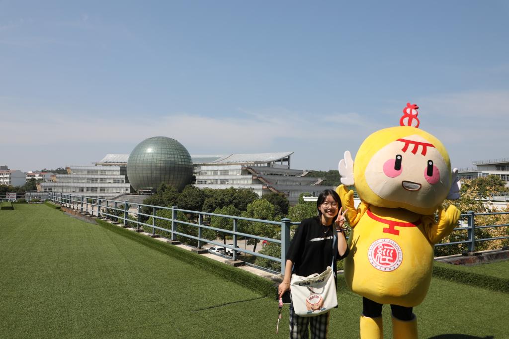 深绿色草坪,淡蓝色天空,南财图书馆庄严的伫立着,大学的校园总是魅力无限。在德经楼三楼的草坪上,一抹黄色的身影又增添了亮色。细瞧发现这一抹黄色的身影原来是学长扮成的吉祥物“小经灵”。此刻,小经灵也热情的等待着各位新生们的到来,各种可爱的动作和造型层出不穷,充满活力,看见如此可爱的小经灵,谁能忍住不与它合影呢?一张张合影被记录在相机里,永久的将这美好的画面定格留存下来。