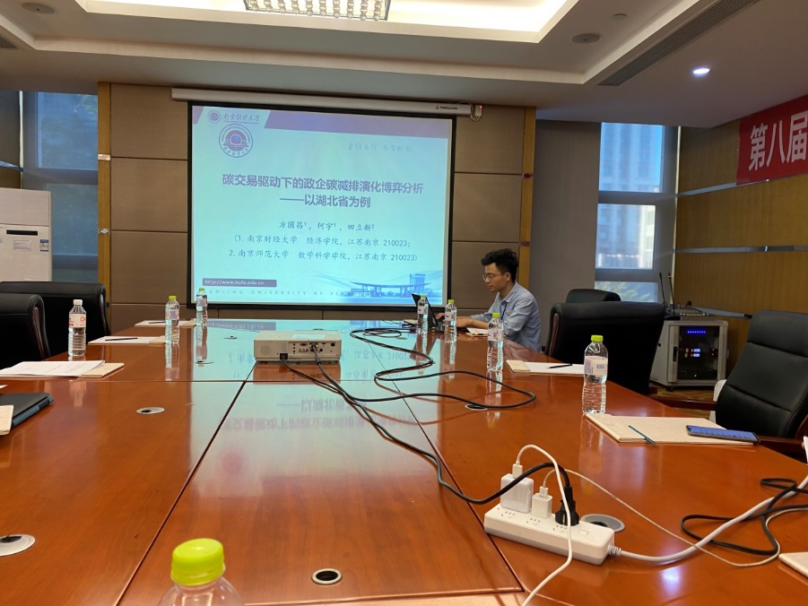 何宇同学在分会场汇报了《碳交易驱动下的政企碳减排演化博弈分析——以湖北省为例》一文。文章在碳交易背景下构建了政企演化博弈的二维动力系统,并以湖北省为例描绘了碳交易市场不同阶段可能存在的情景,为中国碳市场的长期发展提供了政策建议。该文获得了天津大学谢百臣教授、南京航空航天大学吴菲副教授等的充分肯定。